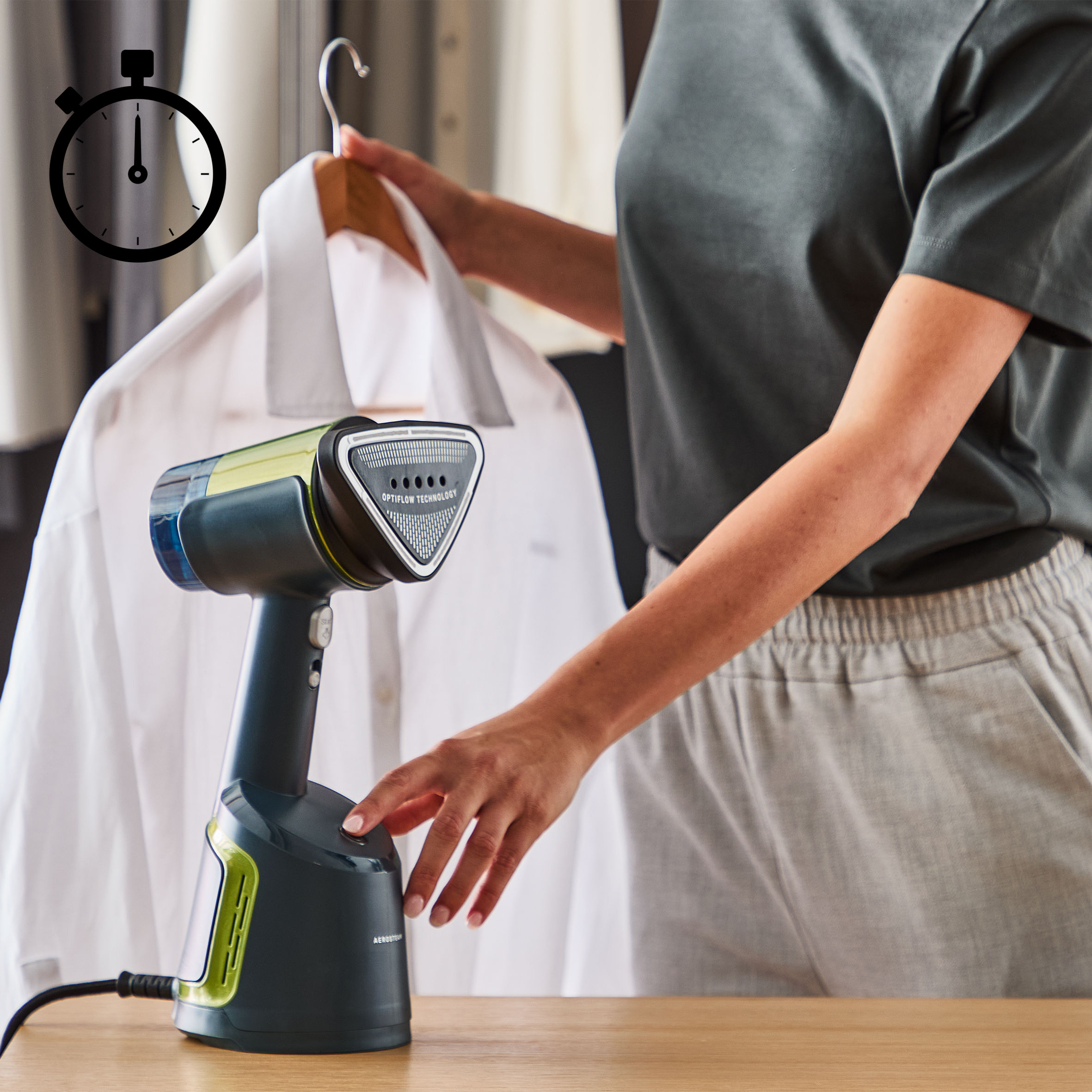Erleben Sie mit der Dampfglätter-Revolution AeroSteam von Tefal die Kraft der Anziehung. Die einzigartige OptiFlow-Technologie kombiniert die Kraft von Dampf und Ansaugung – für makellose Ergebnisse in einem Durchang. Bringen Sie Ihre Textilpflege-Routine auf ein neues Level und entdecken Sie Ihre brandneue Komplettlösung für perfekte und mühelose Ergebnisse.