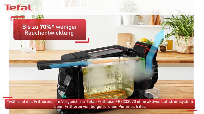 FRITTIEREN MIT WENIGER RAUCH: Entdecken Sie eine moderne Fritteuse, die mit einem innovativen aktiven Luftstromsystem ausgestattet ist, das die Rauchentwicklung um bis zu 70 %* reduziert und so ein einfaches und komfortables Frittieren ermöglicht WENIGER GERÜCHE: Erleben Sie perfekte Ergebnisse mit einem einzigartigen aktiven Filtersystem, das Gerüche um bis zu 43 % reduziert,* für unwiderstehliche Frittierköstlichkeiten ohne starke Gerüche EXTRA GROSSES BESCHLAGFREIES FENSTER: Behalten Sie den Kochvorgang durch das extra-große Sichtfenster, das nicht beschlägt, stets im Blick GROSSES FASSUNGSVERMÖGEN: Bis zu 1,2 kg Lebensmittel beim Garen von Zutaten wie Chicken Nuggets oder 650 g Zutaten wie tiefgefrorene Pommes frites – eine Fritteuse, die ideal für eine Vielzahl von unwiderstehlichen Leckereien ist LEICHTE REINIGUNG: Reinigen ist dank der abnehmbaren und spülmaschinenfesten Teile, einschließlich Öltank, Deckel, Frittierkorb, Aluminiumfilter, Kohlefilterdeckel und Auffangbehälter für überschüssiges Öl, ein Kinderspiel TEMPERATUR UND TIMER EINSTELLBAR: Die Temperaturregelung sorgt für präzise Einstellungen, damit die Mahlzeiten stets perfekt gelingen, mit einem Timer für eine Dauer von bis zu 30 Minuten für den absoluten Komfort. SAUBERES UND SICHERES FRITTIEREN: Das intelligente und sichere Design ermöglicht das Absenken des Frittierkorbs bei geschlossenem Deckel, um Ölspritzer und mögliche Verbrennungen zu vermeiden, und der Cool-Touch-Griff sorgt für zusätzliche Sicherheit BENUTZERFREUNDLICH: Mit leicht abnehmbaren Teilen und einem Zusammenbau, der einfacher nicht sein kann. Entdecken Sie eine Fritteuse, die das Kochen zum Kinderspiel macht. 15 JAHRE REPARIERBARKEIT: Kostengünstige schnelle Leistung von 6200 Reparaturzentren weltweit — ein Teil unseres Engagements für den Umweltschutz und die Abfallreduzierung LIEFERUMFANG: Clear Duo Fritteuse, Korb mit Griff