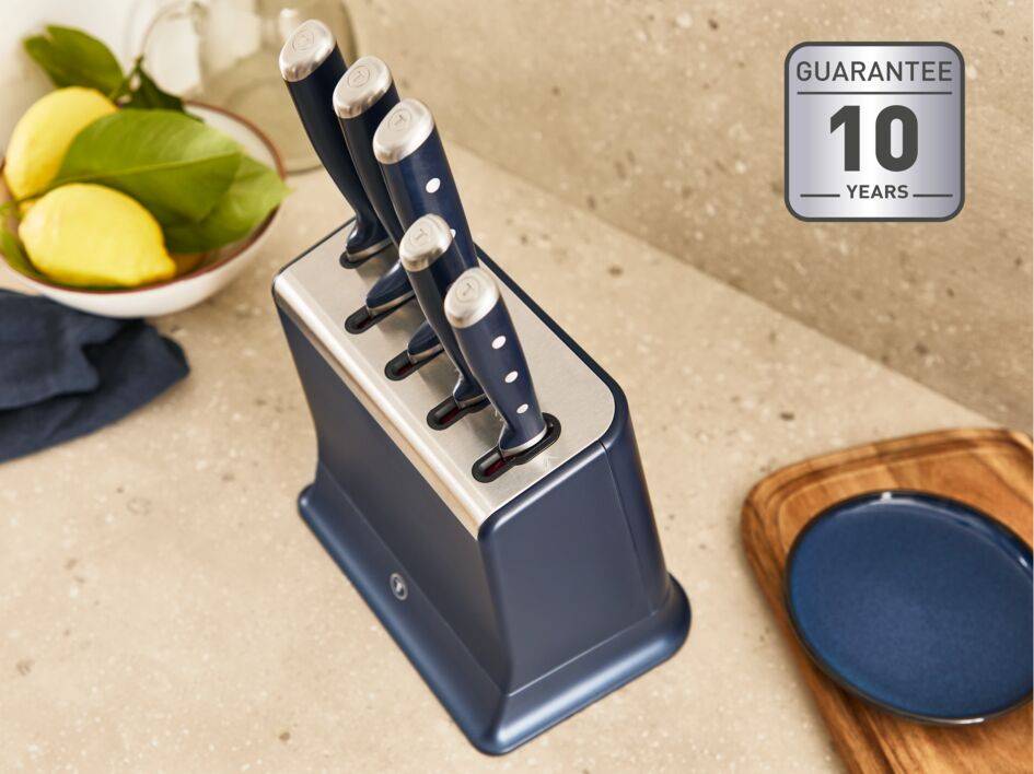 Waschen Sie die Messer per Hand mit einem nicht scheuernden Schwamm, trocknen Sie sie sorgfältig ab und stecken Sie sie anschließend in den Messerblock.