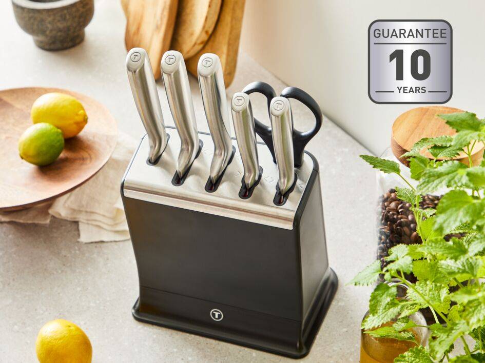 Die patentierte EverSharp Pro-Technologie von Tefal ist unsichtbar im Messerblock integriert. Wie sie funktioniert? Ganz einfach: Schieben Sie das Messer nach dem Gebrauch in den Block – es wird automatisch im perfekten Winkel geschärft, dank des doppelten V-Führungssystems. Schwenkbare Keramikstäbe erfassen die Klinge von der Spitze bis zum Griff und sorgen mit konstantem, optimalem Druck für langanhaltende Schärfe.