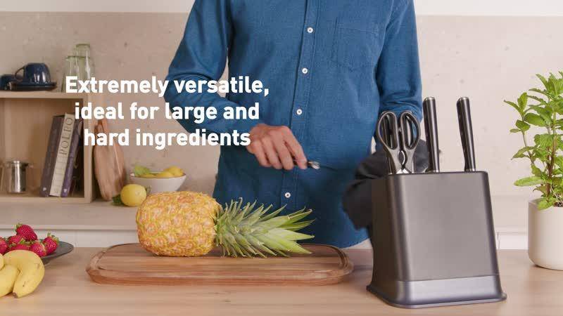 Genießen Sie makellose Schnitte bei jeder Anwendung mit diesem außergewöhnlichen Kochmesser – ob Ananas-Carpaccio, Brathähnchen oder ein ganzer gerösteter Blumenkohl. Tefal EverSharp Pro verfügt über ein völlig neuartiges, patentiertes Schärfsystem, das Ihr Messer vor jeder Nutzung perfekt schärft – für langanhaltende Schärfe auf höchstem Niveau.