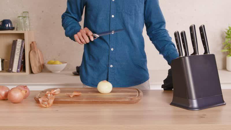 IMMER SCHARF: Erleben Sie müheloses Schneiden mit dauerhaft scharfen Klingen – dank automatischer Schärfung vor jeder Nutzung, Tag für Tag PATENTIERTE TECHNOLOGIE: Das integrierte Schärfsystem im Messerblock in elegantem Dunkelblau führt die Klinge präzise und schärft sie mit optimalem Druck MÜHELOSE HANDHABUNG: Einfach das Messer nach dem Gebrauch in den Block stecken – für automatisch scharfe Klingen ohne Aufwand