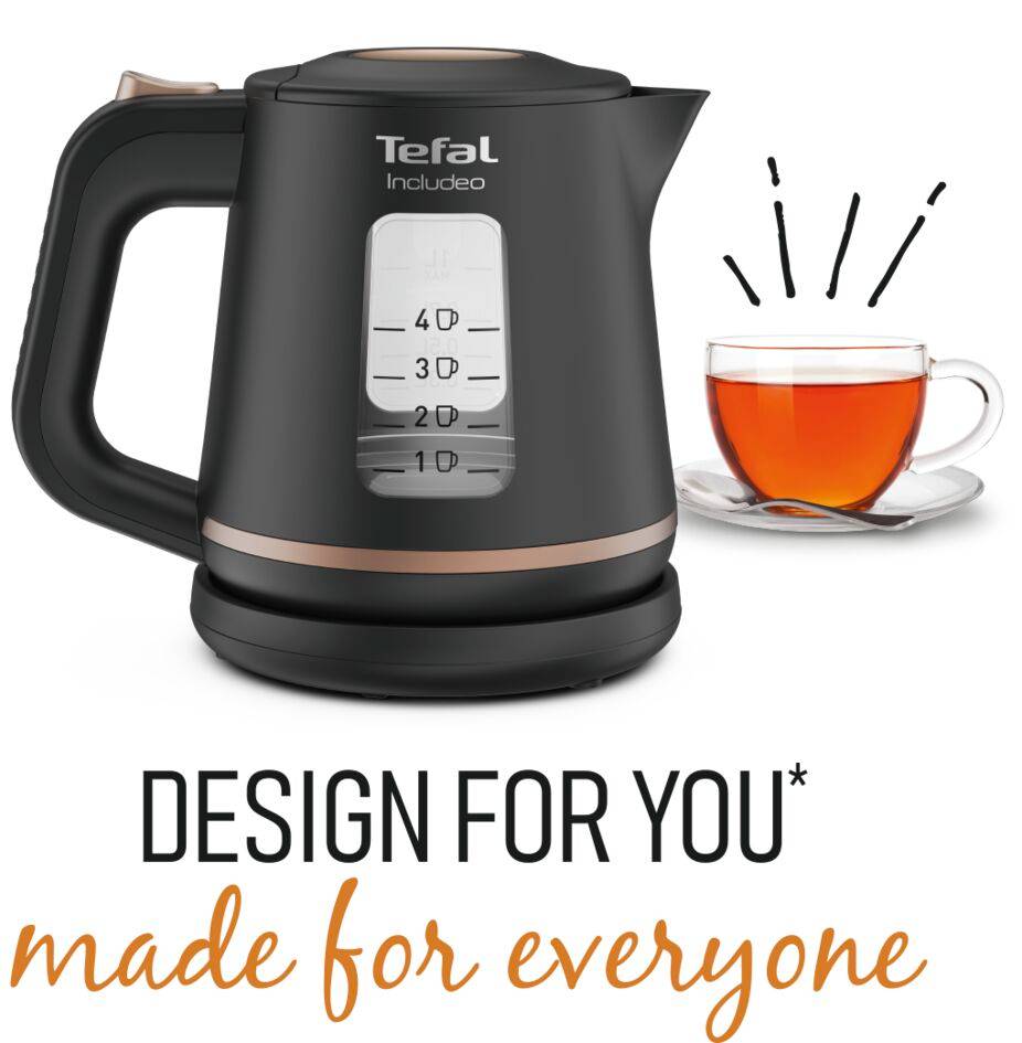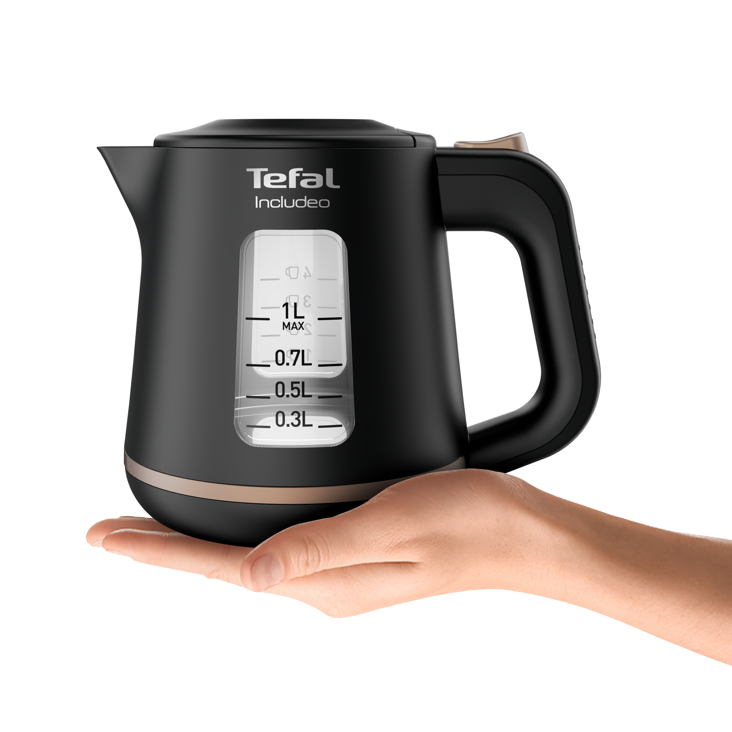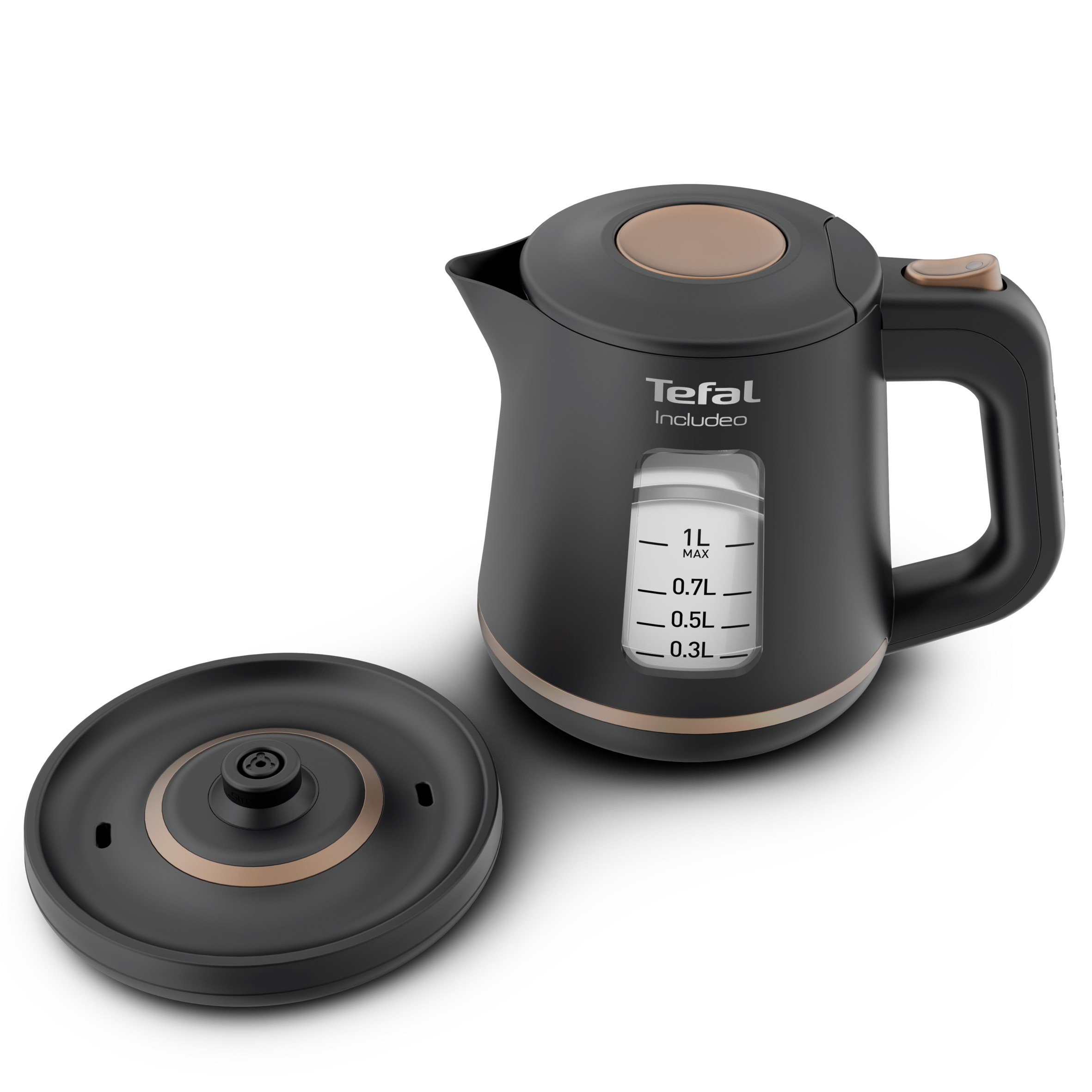 Der Tefal Includeo Wasserkocher eignet sich für jedermann! Vom großzügigen, einfach zu bedienenden Knopf zum Öffnen und Schließen auf dem Deckel, bis zum robusten Anti-Rutsch-Griff – Tefal hat an alles gedacht, um den täglichen Gebrauch möglichst einfach zu gestalten. Mit einem angenehmen Gewicht und einer Kapazität von 1 Liter verfügt dieser elektrische Wasserkocher über eine große Wasserstandsanzeige auf beiden Seiten mit klaren Maßangaben zum einfachen Ablesen. Ferner verfügt dieser Wasserkocher über einen 360°-Drehsockel mit einem kontrastfarbenen Ring für einfaches Abstellen aus jeder Position. Abgerundet wird das Ganze durch einen leicht zu bedienenden Ein-/Ausschalter mit Kontrollleuchte und eine präzise Ausgießhilfe für einfaches Servieren. Tefal Includeo: für Sie entworfen – für jedermann geeignet!