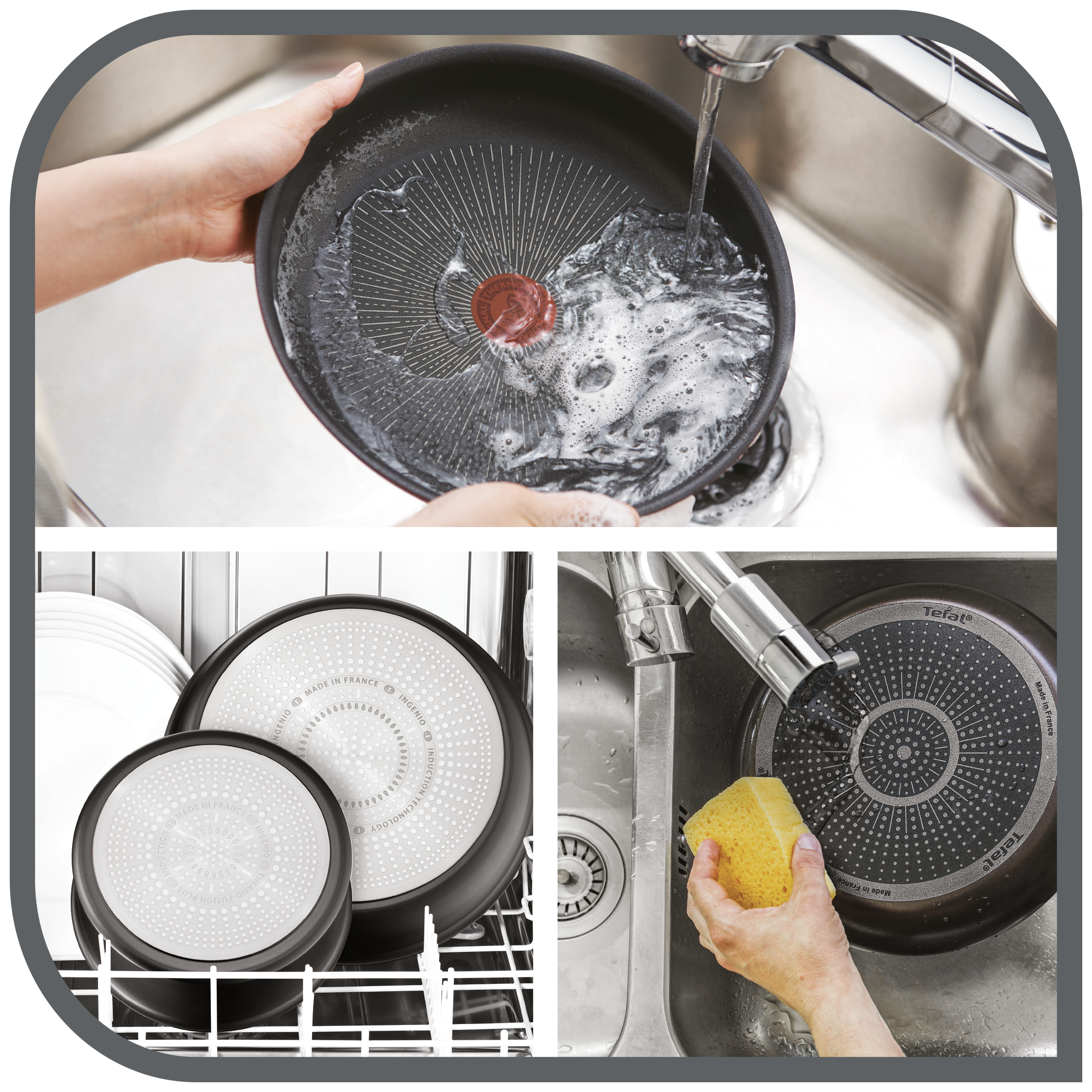 Reinigen Sie Ihr Ingenio Kochgeschirr mit einem milden Reinigungsmittel und einem nicht scheuernden Schwamm. Das Kochgeschirr ist spülmaschinengeeignet, wir empfehlen jedoch die Reinigung mit der Hand.