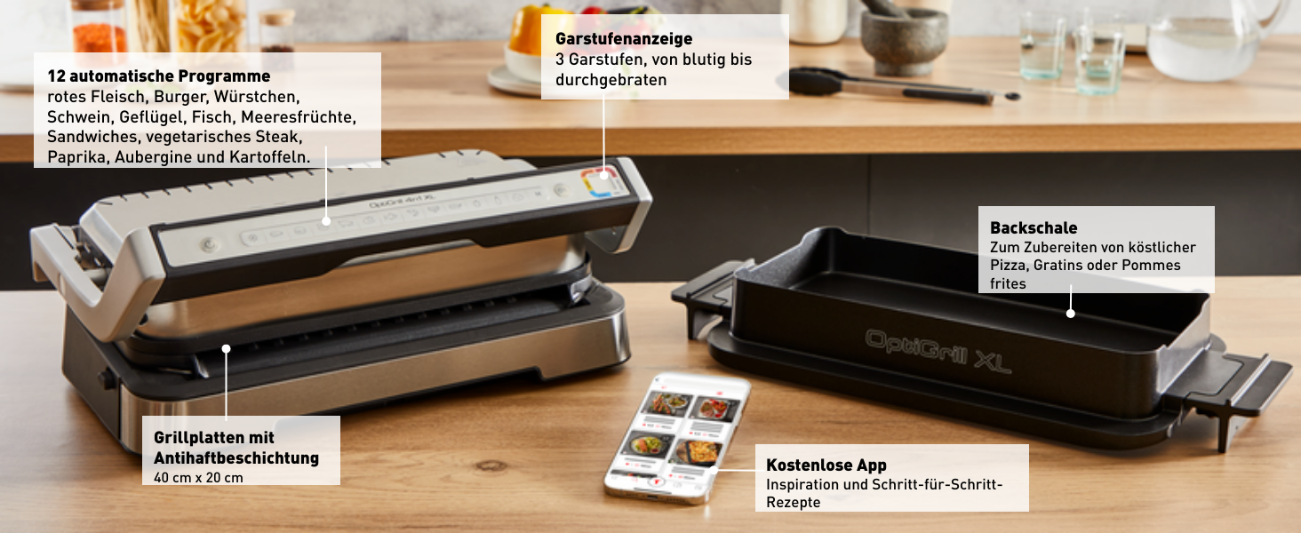 OptiGrill XL 4in1 sorgt für perfekte Grillergebnisse nach Ihrem Geschmack, mit XL-Kapazität. Das Gerät kombiniert einen intelligenten Grill mit einem BBQ und ein Backofen in einem praktischen Gerät für all Ihre täglichen Mahlzeiten – von saftigem Fleisch bis zu gegrilltem Gemüse, Pizza und mehr. Die patentierte Technologie misst die Dicke von Fleisch, Fisch oder Gemüse auf den Millimeter genau, berücksichtigt die Anzahl der Stücke und passt die Garzeit automatisch an, für perfekte Ergebnisse!