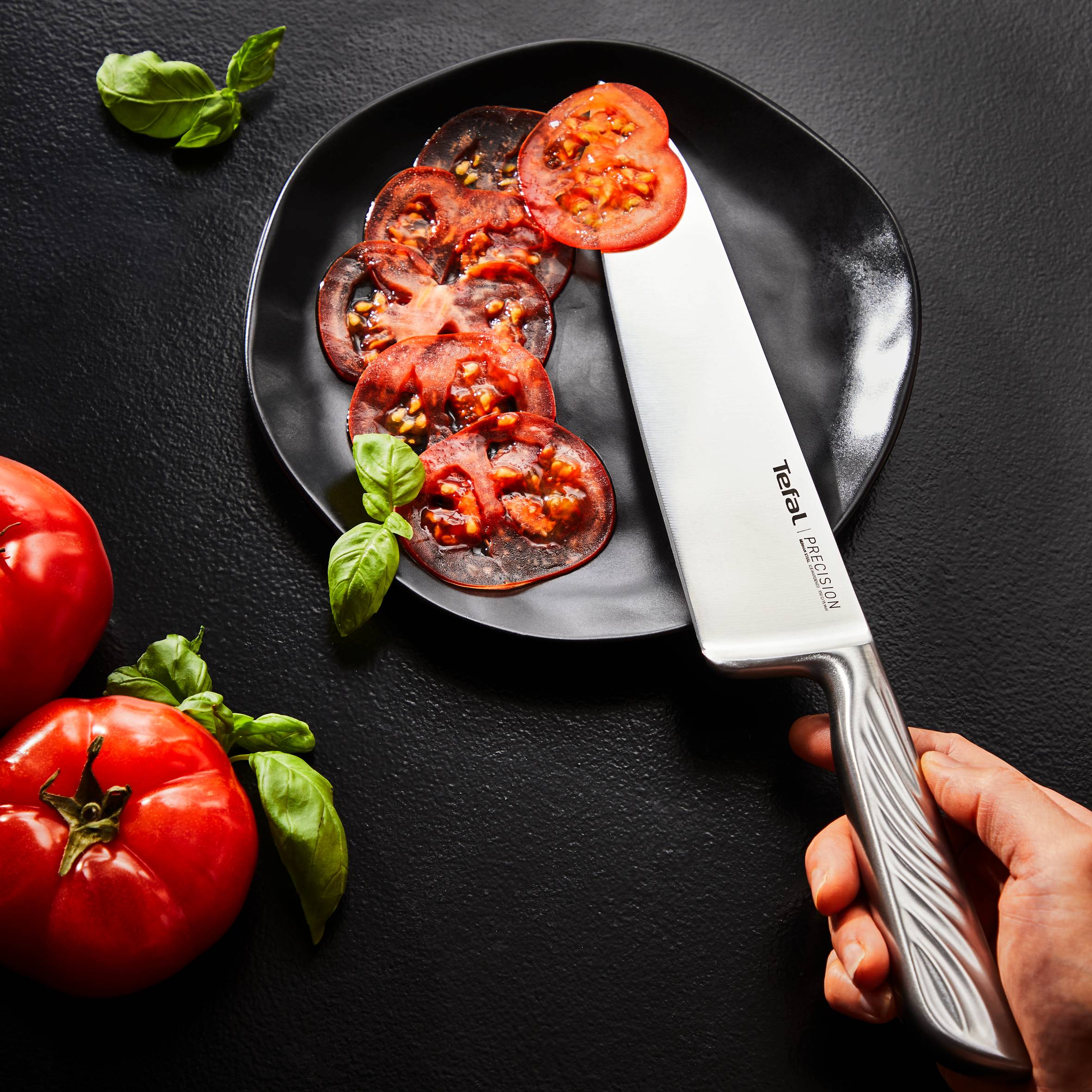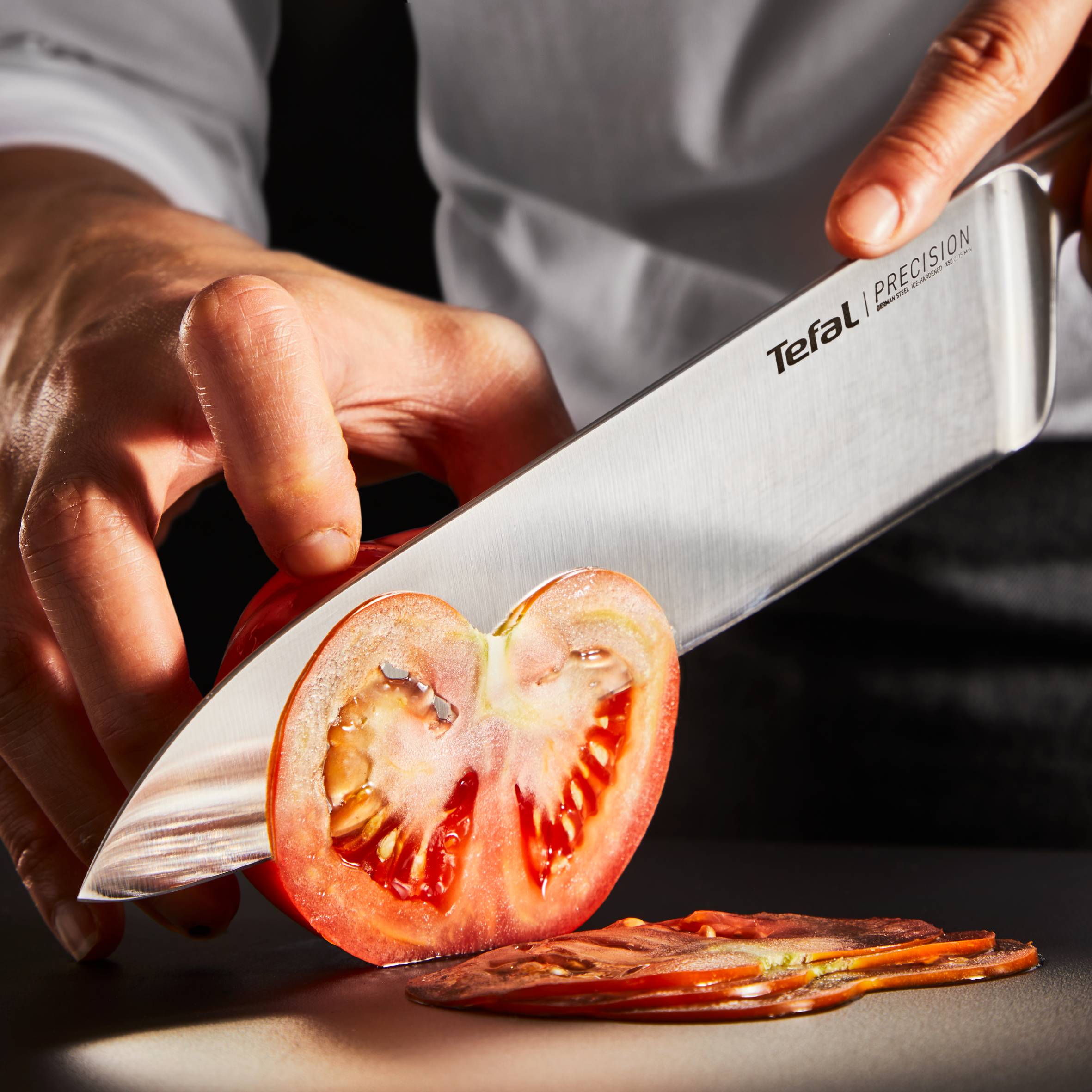 Entdecken Sie Precision, die schärfste Messerkollektion von Tefal, und erleben Sie jedes Mal einen perfekten, präzisen Schnitt. Es ist das Küchenmesser, das mühelos jede Zutat schneidet - und das in perfekter Eleganz! Genießen Sie die eleganten Linien und den endlosen Komfort in der Hand. Vollständig aus deutschem Edelstahl gefertigt und mit unserem speziellen Eishärteverfahren behandelt, verspricht Precision langanhaltende Leistung, besondere Langlebigkeit und Korrosionsbeständigkeit