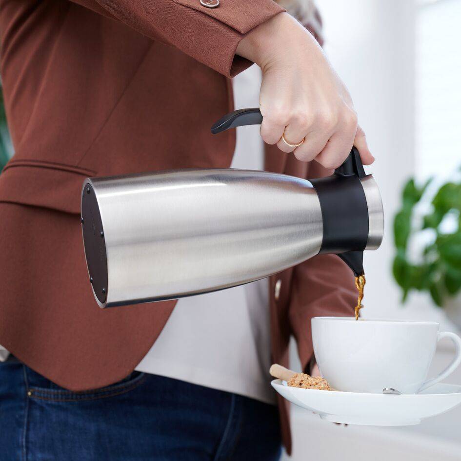 Verbringen Sie weniger Zeit mit der Kaffeezubereitung und haben Sie mehr Zeit für sich selbst dank der Soft Grip Isolierkanne. Die Soft Grip Isolierkanne besteht aus doppelwandigem Edelstahl für hervorragende Isolierleistung und lang anhaltendes Aroma. Der Quick-Tip-Verschluss und der Soft-Grip-Griff sorgen für eine komfortable Einhandbedienung. Das trendige Design wird mit einer schlanken Form kombiniert, um Platz zu sparen und Ihren Events zu Hause Eleganz zu verleihen. Das auslaufsichere Design sorgt für absolute Unbesorgtheit und tropffreies Ausgießen.