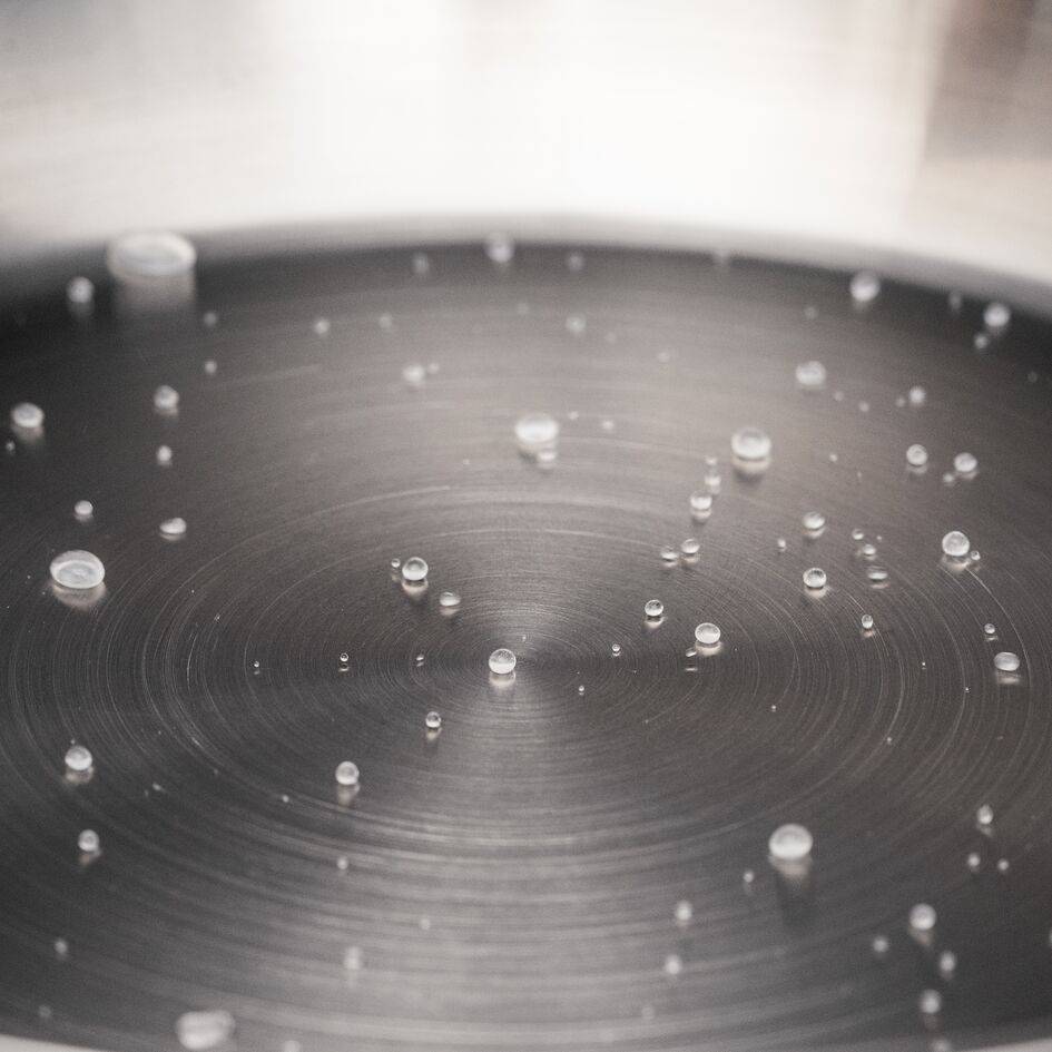 Geben Sie ein paar Tropfen Wasser in die Pfanne, und wenn sie abperlen, ist die Pfanne heiß genug, um mit dem Kochen zu beginnen.